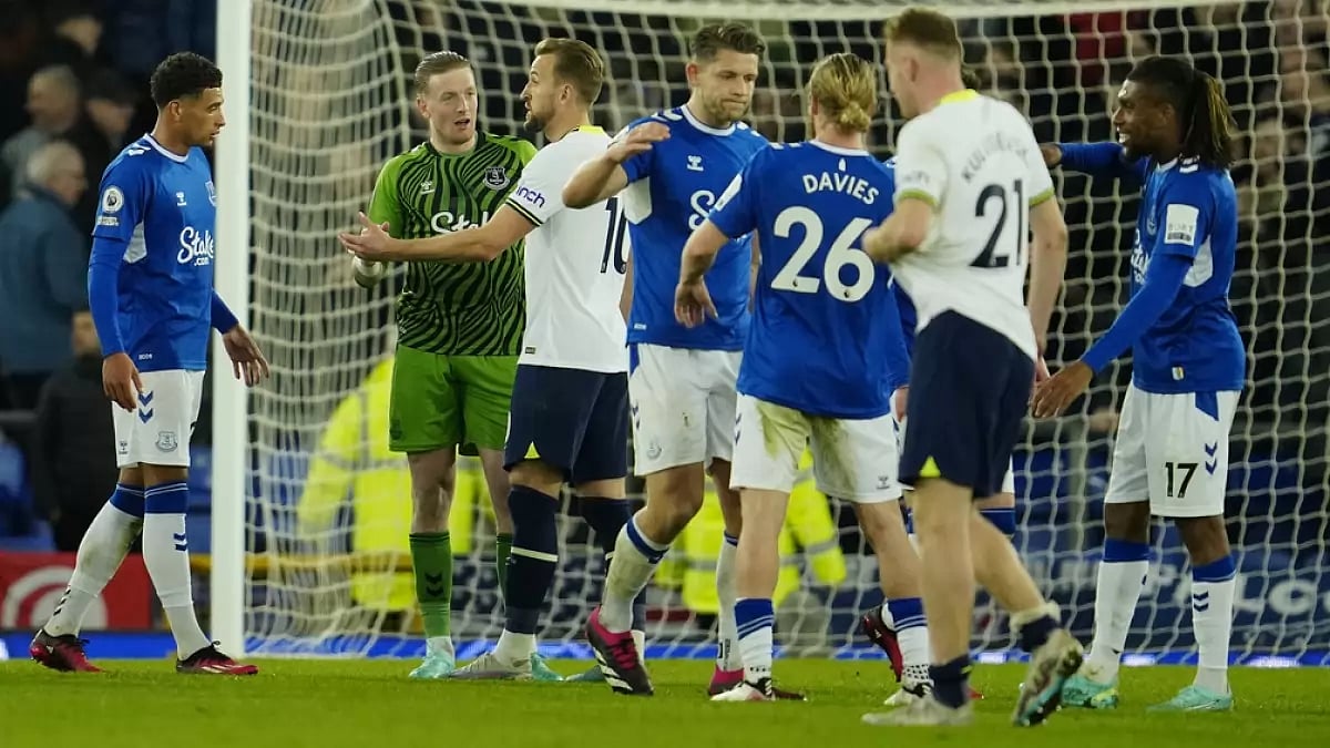 Harry Kane put Tottenham Hotspur ahead at Goodison Park, converting a penalty past England teammate Jordan Pickford in the 68th for his 22nd goal of the season after a foul by Keane on Cristian Romero.