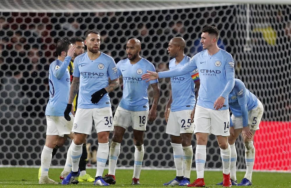 Defending champions Manchester City registered a hard-fought 2-1 win at Vicarage Road to extend the lead at the top of the England Premier League table to five points even as Bournemouth produced an identical result against visiting Huddersfield at home on Tuesday night.