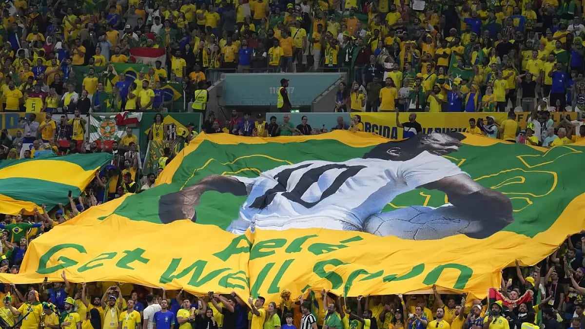 Fans displayed a banner with the image of Pelé holding a soccer ball behind one of the goals at Lusail Stadium. A large image of the Brazil great could be seen on a building near the venue, along with the messages “get well soon” and “we love Pelé.”