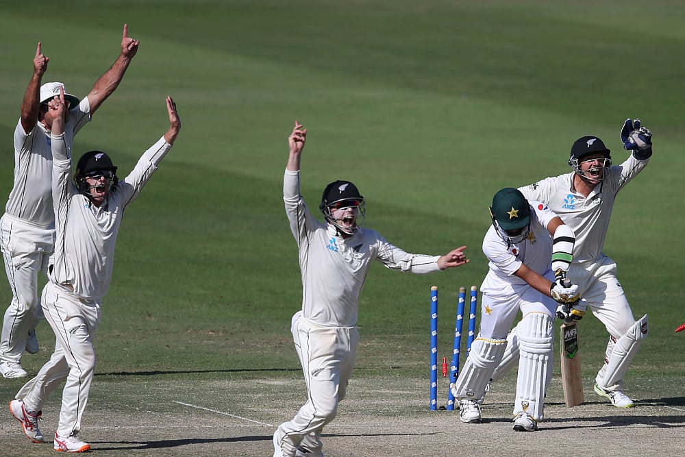 Defending a modest 176-run target, New Zealand bowlers led by Patel (5/59), fast bowler Neil Wagner (2/27) and Ish Sodhi (2/37) bowled out Pakistan for 171 on a drama-packed fourth day of the first Test at Sheikh Zayed Stadium.