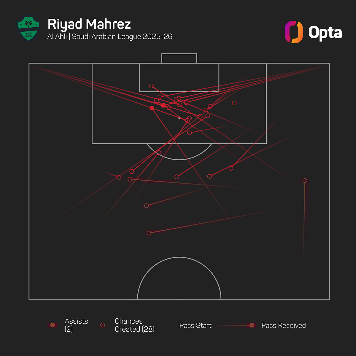 He has scored just one goal in nine Saudi Pro League games for Al-Ahli this season, having recorded 18 goal contributions last term (eight goals, 10 assists), though his 28 chances created are the second-most in the division in 2025-26.