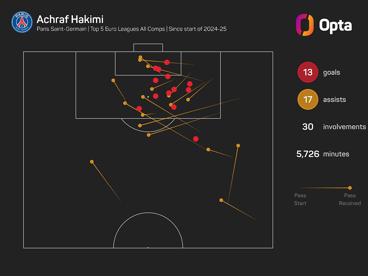 Over this season and last, no defender from Europe's top five leagues has more goal contributions than Hakimi (30 – 13 goals, 17 assists), putting him level with Alejandro Grimaldo of Bayer Leverkusen.
