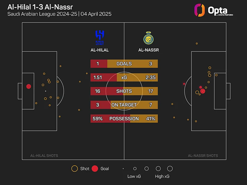And they were worthy of their win, ending the contest with an expected goals (xG) total of 2.37 from their 18 shots to Al-Hilal's 1.61 from their 16 attempts, though only three of those were on target on a frustrating evening for Jorge Jesus' team.