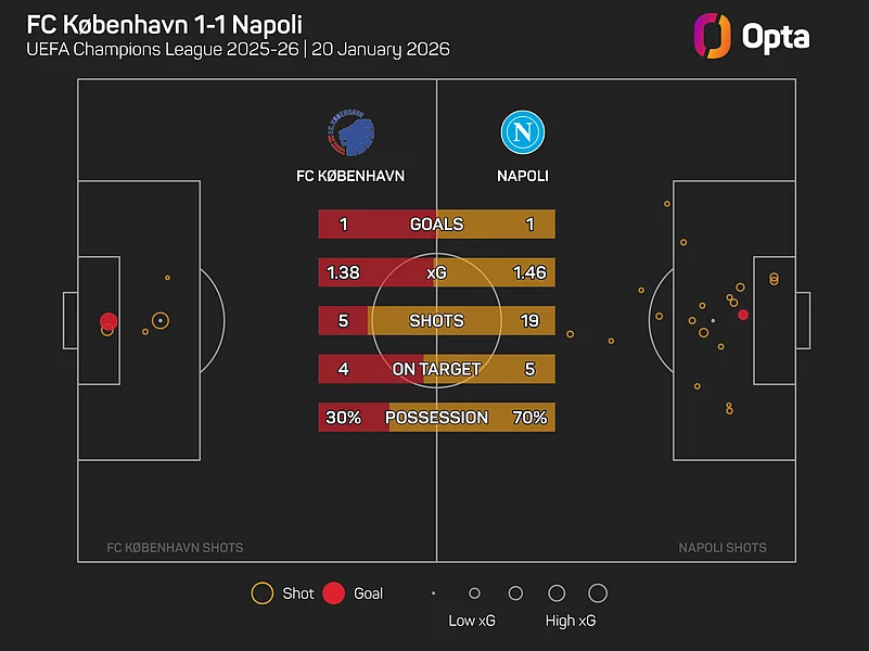 However, they had 19 shots, 55 touches in the opposition box, 70 final-third entries and bossed possession with 70.4% of the ball and were in a dominant position, with all of Copenhagen's attempts coming after the hour-mark.