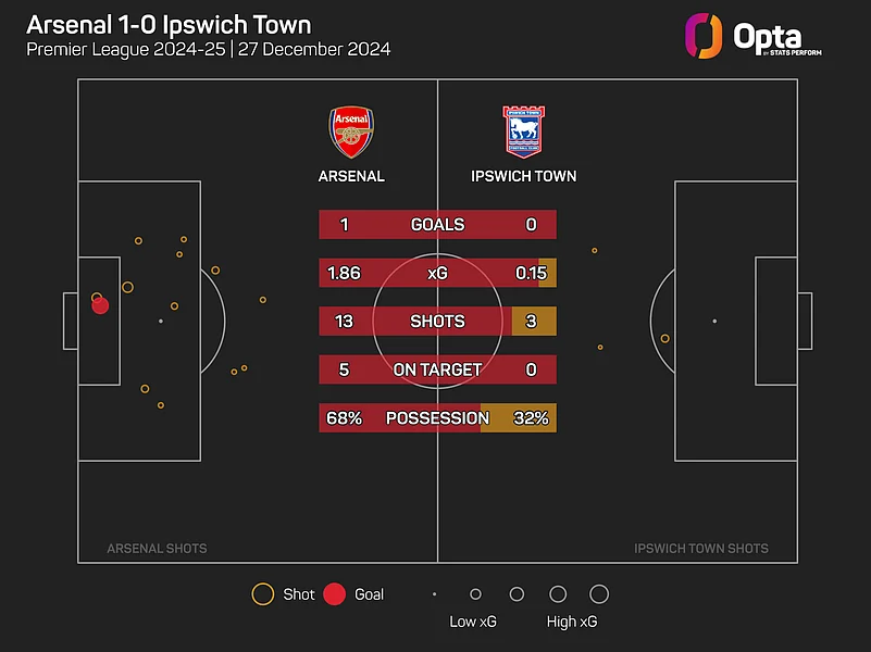 However, they managed to frustrate Arsenal for long periods, with the first half containing a total of four shots – the fewest in the opening 45 minutes of a Premier League game since West Ham against Newcastle United in October 2023 (also four).