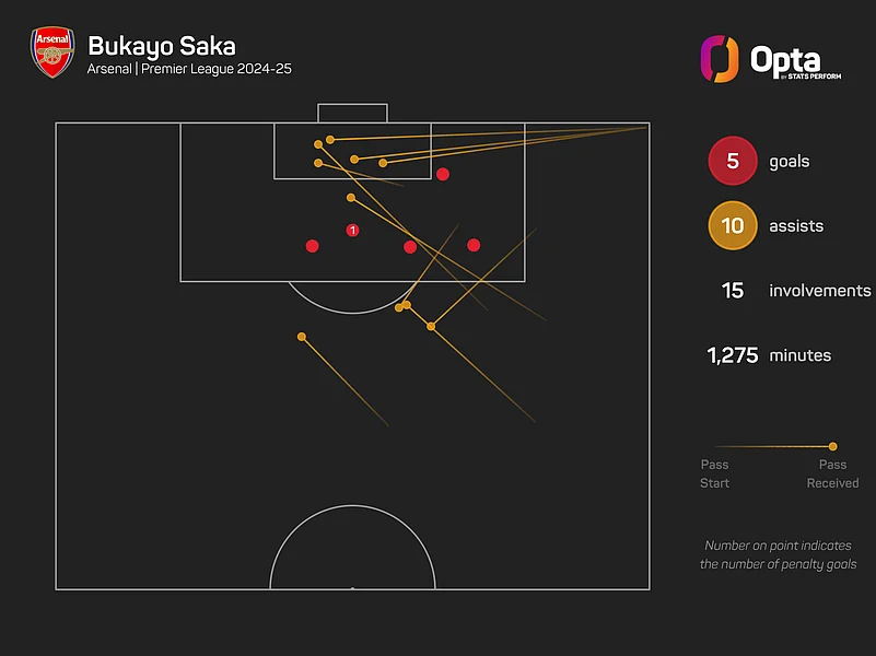 Only Chelsea's Cole Palmer (48) has created more chances in the Premier League this season than Saka (42), while his 15 goal involvements are only bettered by Palmer (18) and Liverpool's Mohamed Salah (27).