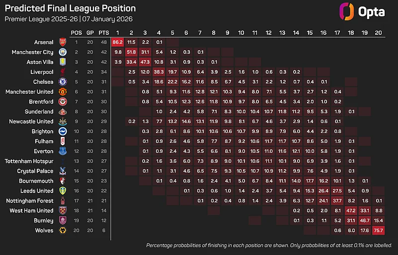Liverpool's probability of retaining their title, meanwhile, is 0.07% after a turbulent period between September and November.