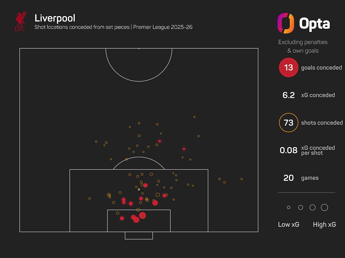 The Reds have shipped the joint-most goals from set-pieces in the Premier League this season (13, level with Bournemouth), with 46.4% of the goals they have conceded coming via this route.
