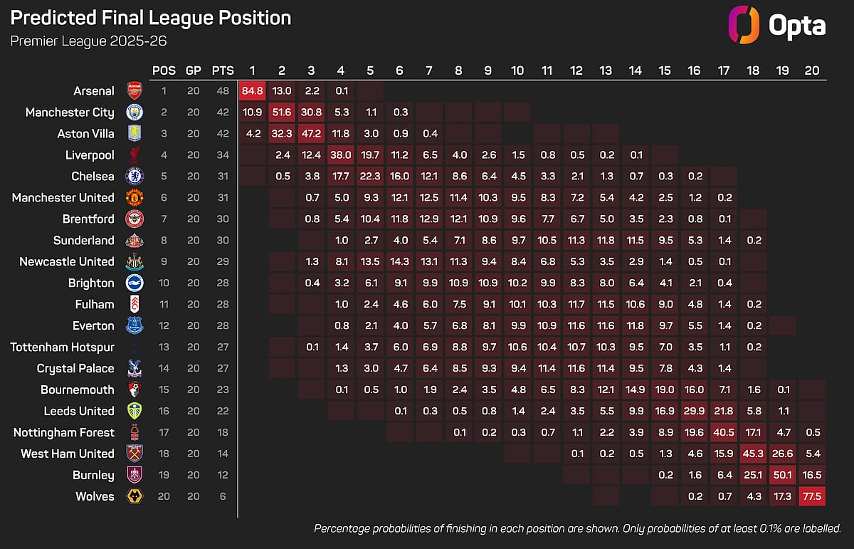 City only won the title in 10.9% of the model's season simulations, with Villa doing so in 4.2% and Liverpool's chances now virtually non-existent at 0.07%.