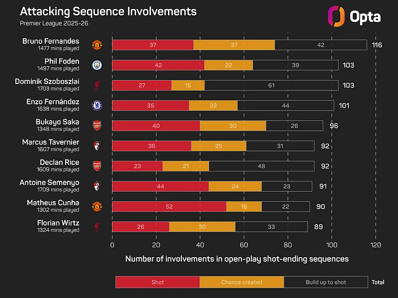 Only Bruno Fernandes has been involved in more open-play sequences ending in a shot (116) than Szoboszlai (103) in the Premier League this season.