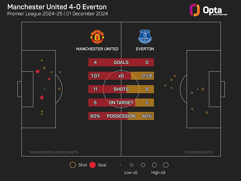They registered 59.9% possession, 630 total passes and three big chances in that match, with all of those figures bettering their per-game averages under former boss Erik ten Hag this term (52.2% possession, 494 passes and 2.9 big chances).