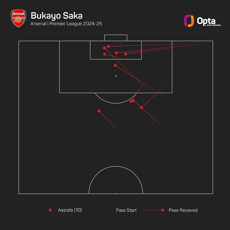 Saka has now provided 10 assists in Arsenal’s 13 Premier League games this season – only Harry Kane (11 in 2020-21), Cesc Fabregas (12 in 2014-15) and Mesut Ozil (12 in 2015-16) have reached double figures fewer games into a team's Premier League campaign.
