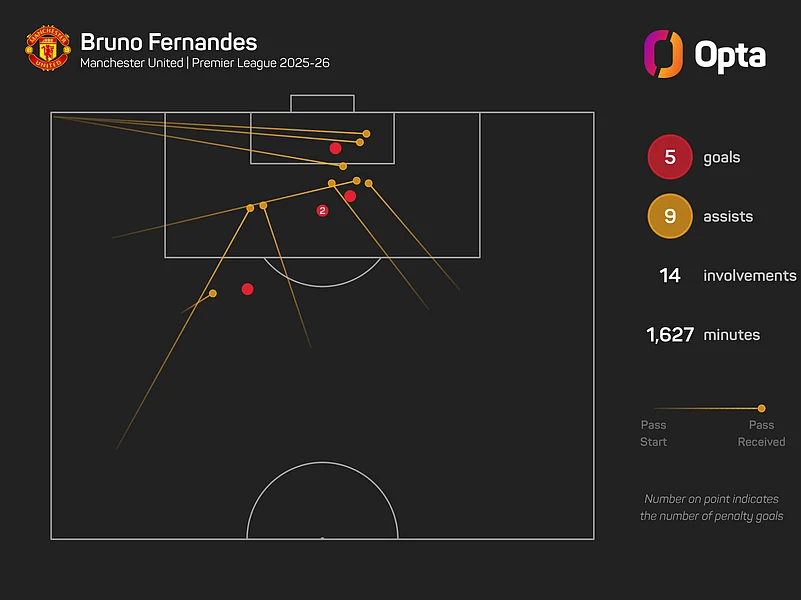 The Portugal international ranks first for chances created both in open play (40) and from set plays (22) and his current ratio of 3.4 chances created per 90 minutes is the best by a United player since Ryan Giggs in 2008-09 (3.7).
