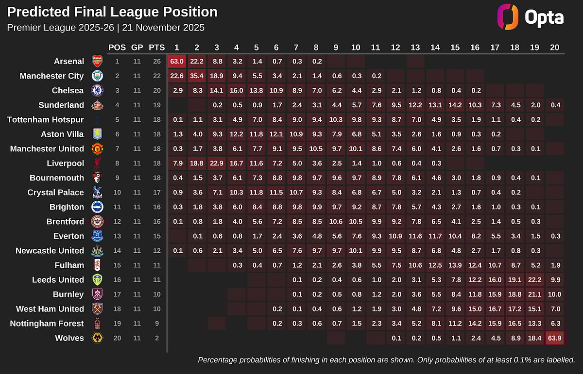 According to the supercomputer's 2025-26 season predictions, Arsenal's hopes of clinching the title dropped to 64.2% following their draw with Sunderland, but they are still significantly higher than those of second-placed Manchester City, at 22.4%.