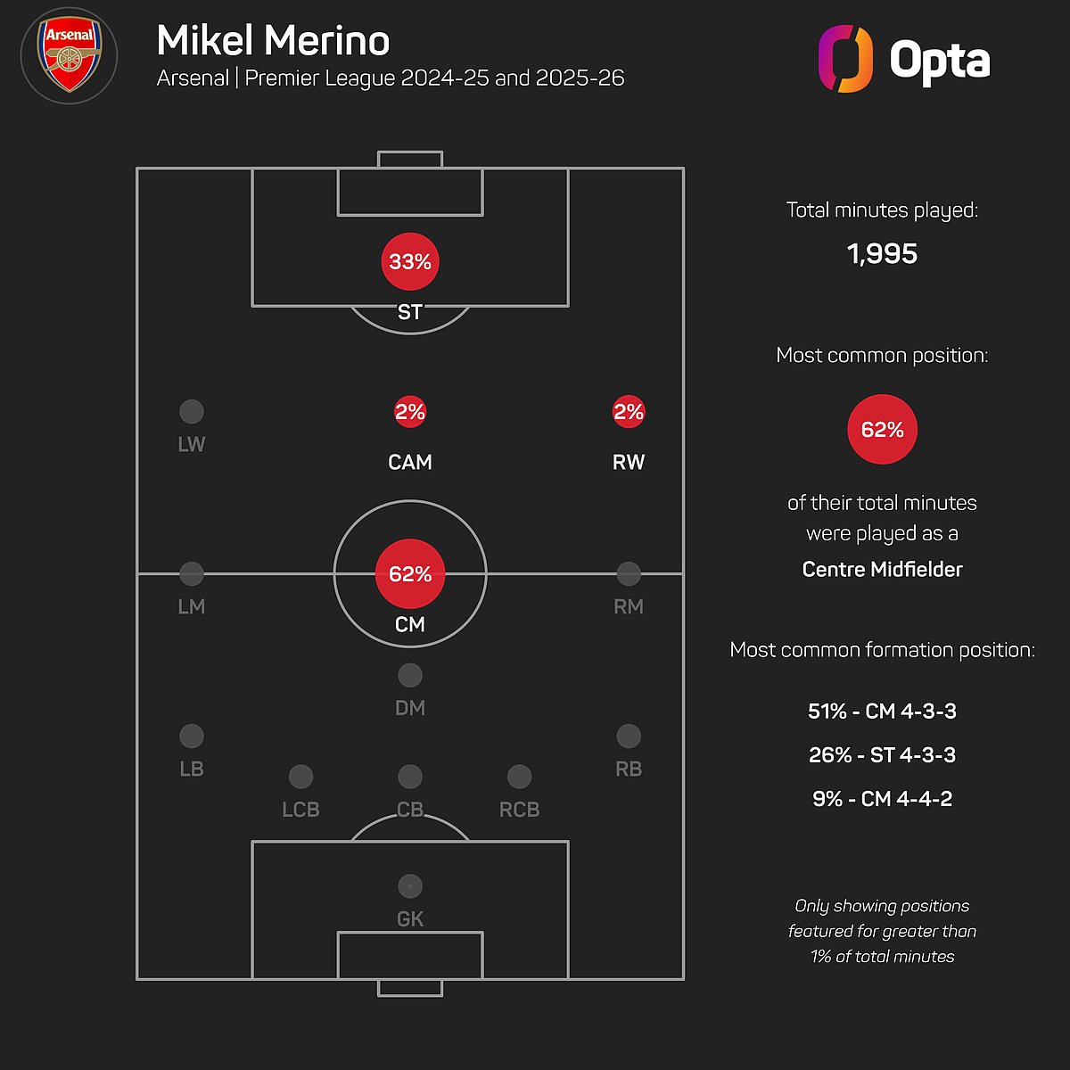 Merino has played 33% of his Premier League minutes for Arsenal as a striker, compared to 62% in his natural central midfield position. The Spaniard has come up with some big moments in front of goal, and the Gunners may need another this weekend.