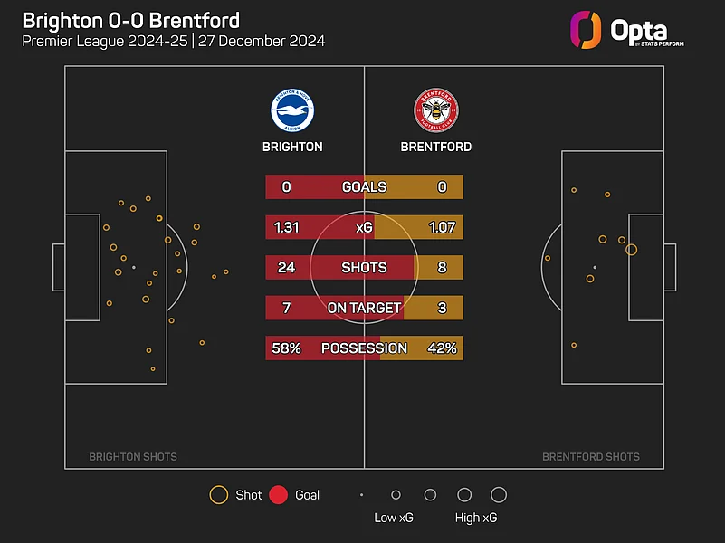 Brighton were unable to make their chances count on Friday, registering an expected goals (xG) total of 1.31 from their 24 shots, though only seven of which were on target.