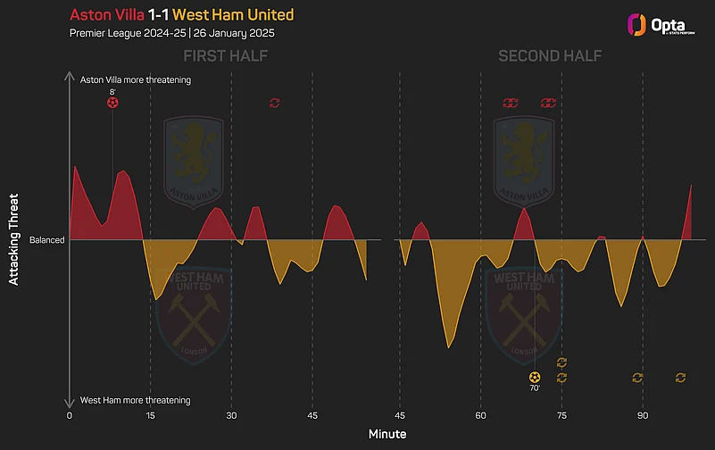 Villa lost 1.39-0.79 in the expected goals (xG) statistics, having led on that metric at half-time, while the hosts also managed just six shots to West Ham's nine after the break.