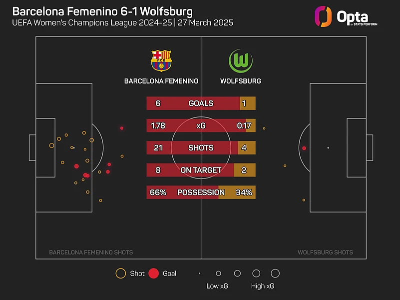 Holders Barcelona crushed Wolfsburg at the Estadi Johan Cruyff 6-1 to bring up a 10-2 aggregate success in the Women's Champions League quarter-finals. (More Football News)
