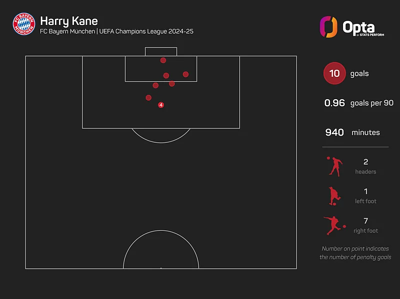 Kane has been directly involved in 24 goals in 23 Champions League appearances for Bayern (18 goals, six assists), the most of any player since the start of last season.