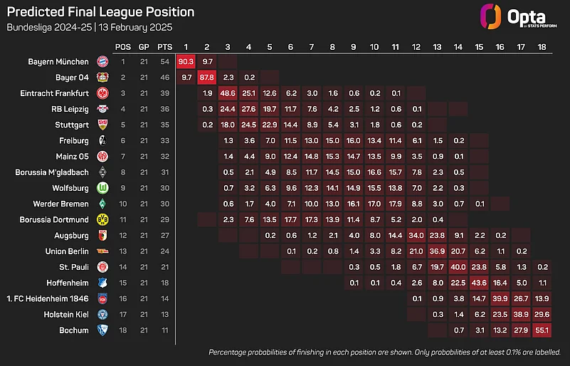It also predicts that Kompany will guide Bayern to a 34th Bundesliga title, with 90.3% of the simulations seeing Die Roten finish top. Leverkusen, meanwhile, are given just a 9.7% chance of defending their crown.