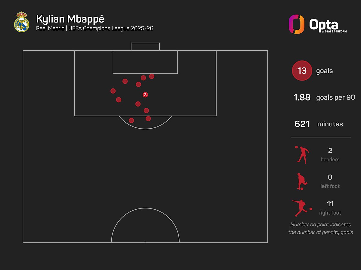 Mbappe's tally for Madrid in UEFA's flagship competition in 2025-26 is 13 in seven appearances. Of players with 5+ games played, this is the highest goals-per-game ratio of any player in a single European Cup/Champions League campaign (1.86).
