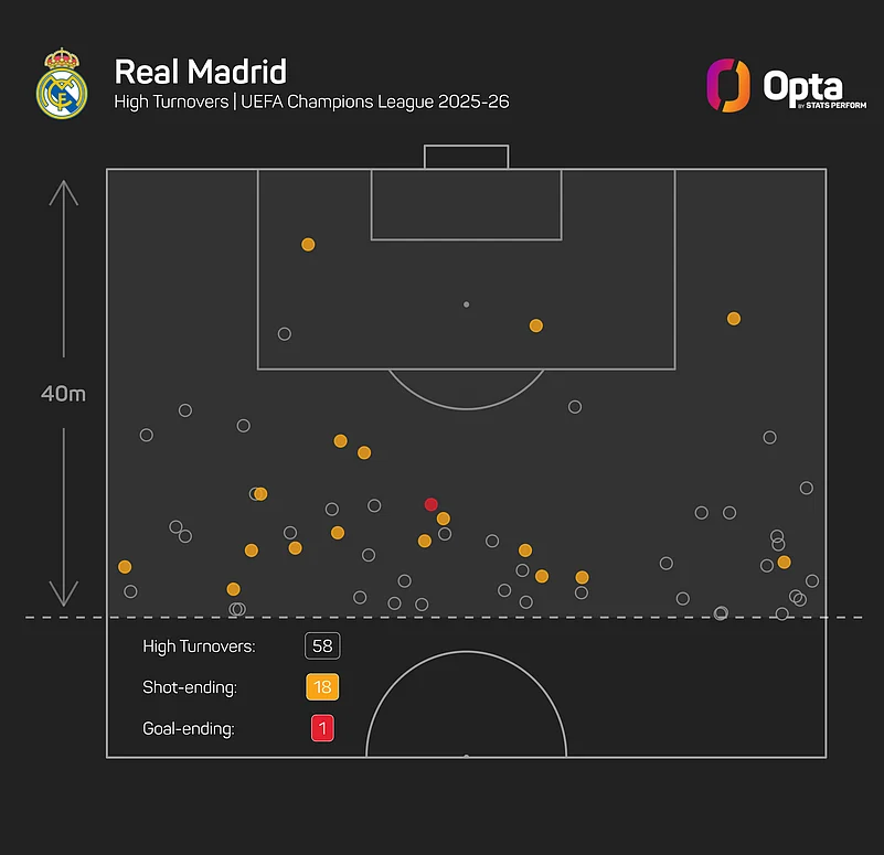 Los Blancos ranked 22nd in the league phase of this season's Champions League for high turnovers (58).
