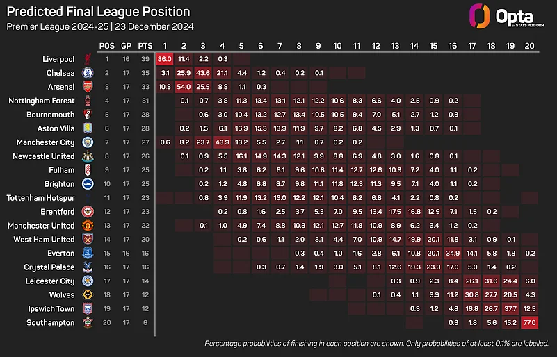 It is the 21st time Liverpool have been top of the English top-flight on Christmas Day; the most of any side. They have gone on to win the title in 11 of those previous 20 seasons (55%).