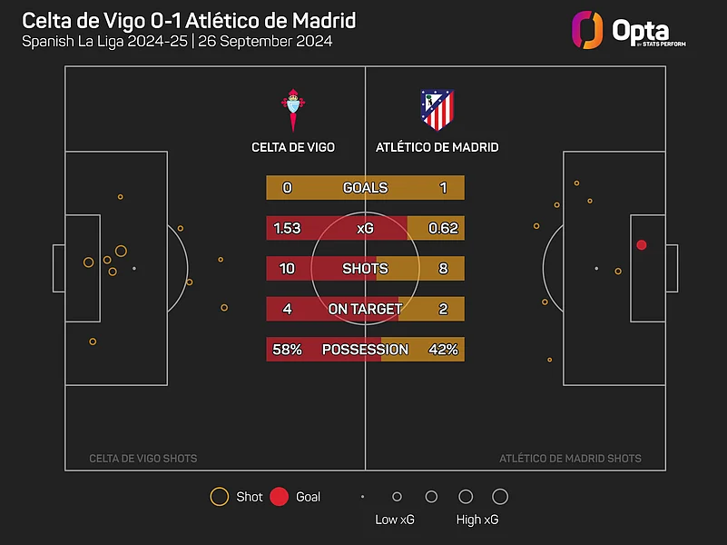 At the other end, Simeone's men only managed two shots on target and generated just 0.62 expected goals (xG) to the hosts' 1.53 xG, but Julian Alvarez's late goal inflicted Celta's first home defeat in seven months.