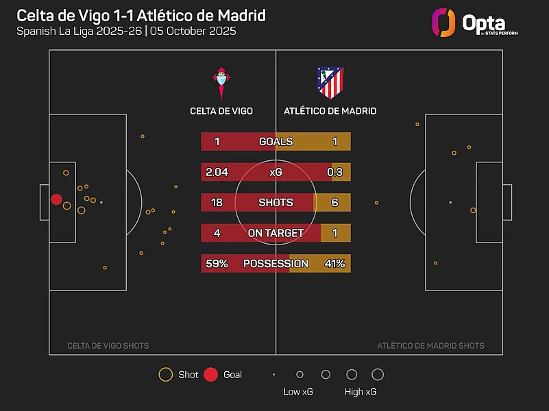 Celta will look back at this game as the one that got away having failed to find that elusive first win of 2025-26, with this result made even more frustrating having generated an xG total of 2.04 from their 18 shots to Atletico's 0.3 from their six attempts.