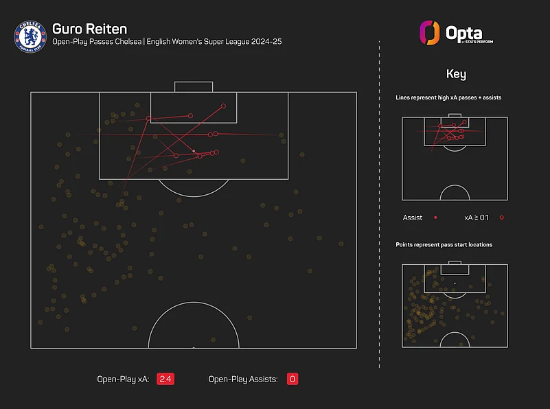 Across the WSL, only Khadija Shaw (nine) and Alessia Russo (seven) have scored more goals than Reiten. Despite her lack of assists, Reiten's figure of 3.7 xA is the highest in the league, while only Katie McCabe (27) and Lauren Hemp (26) have created more chances than her 25.