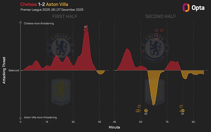 In the first half, Chelsea had 10 shots and racked up 1.98 expected goals (xG), while recording 28 touches in Villa's area. The visitors did not have a single shot and only had three touches in Chelsea's box.