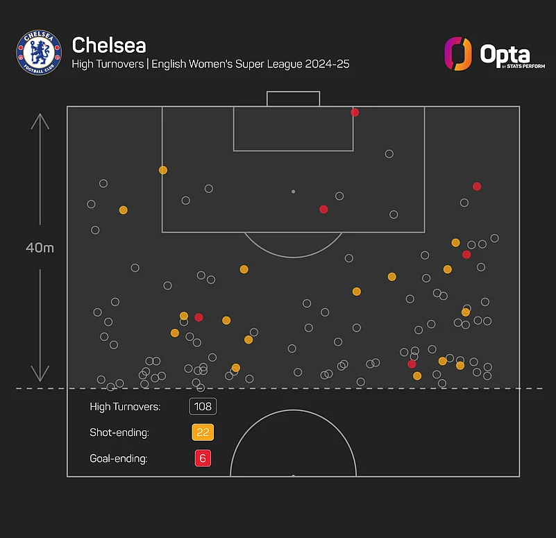 While City have forced more high turnovers (134 to 122) and shot-ending high turnovers (32 to 22) than Chelsea this term, the Blues have turned six of their high turnovers into goals, compared to five for Gareth Taylor's team.