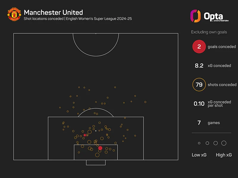 United have therefore conceded the fewest goals in the WSL this season.They are one of just three teams to concede two or fewer goals after seven games of a WSL season, along with Birmingham City in 2011 (two) and Man City in both 2016 (none) and 2019-20 (one).