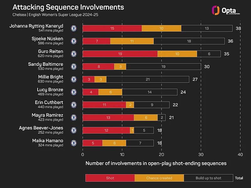Bompastor's Blues certainly give their forwards plenty of opportunities, with Ramirez recording 40 of her touches (19.8%) in the opposition area this season. Only five WSL players have recorded a greater percentage of touches in opposing areas in 2024-25 (minimum 20 touches in the opposition box).
