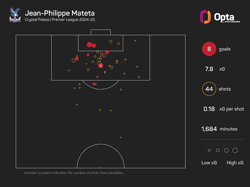 Since Glasner's first Premier League game in charge of Palace on February 24 last year, only three players have scored more goals than Mateta (21 in 35 games).