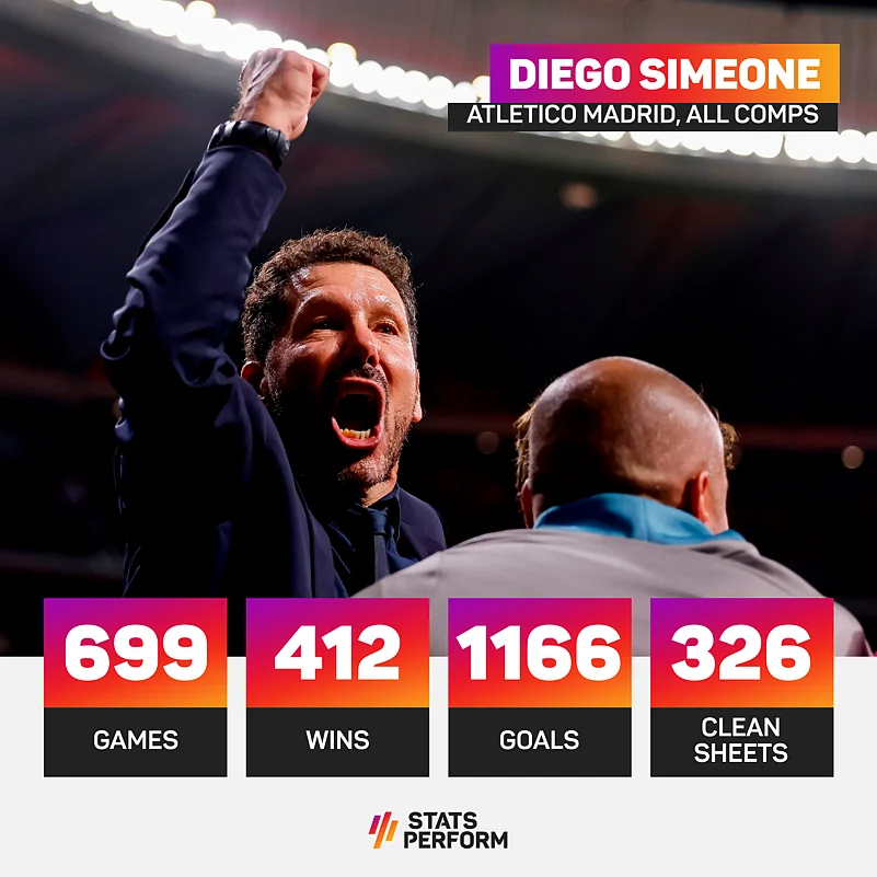 Saturday's game is Simeone's 492nd LaLiga match in charge - the most by any manager at a single club - and he has also managed the third-most games with a single club in the Champions League (109), after Alex Ferguson with Manchester United and Arsene Wenger at Arsenal.