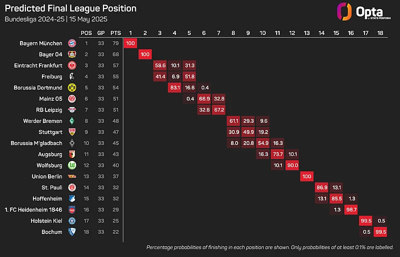 Ahead of the final matchday, the Opta supercomputer gives Dortmund an 83.1% chance of finishing fourth and a 16.6% likelihood of staying in fifth.
