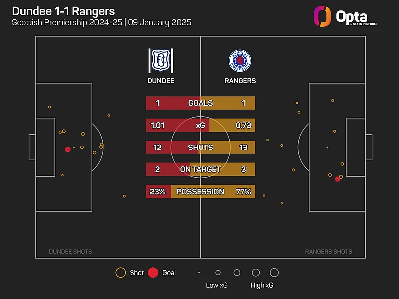 They rarely offered a threat in the final third, registering an expected goals (xG) total of just 0.73 from their 13 attempts, compared to Dundee's 1.01 from their 12 efforts.