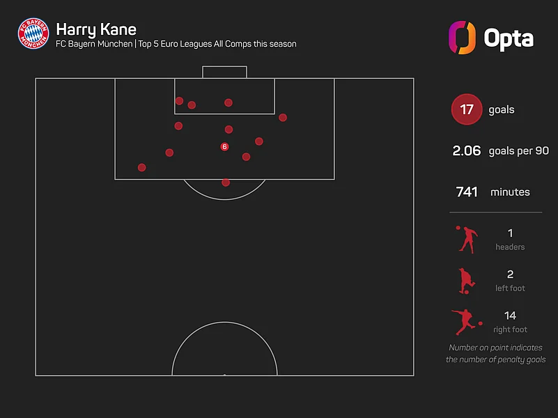 Kane has been involved in 13 goals this Bundesliga season (10 goals, three assists), more than any other player, and five more goal involvements than second-placed Uzun (eight – five goals, three assists).