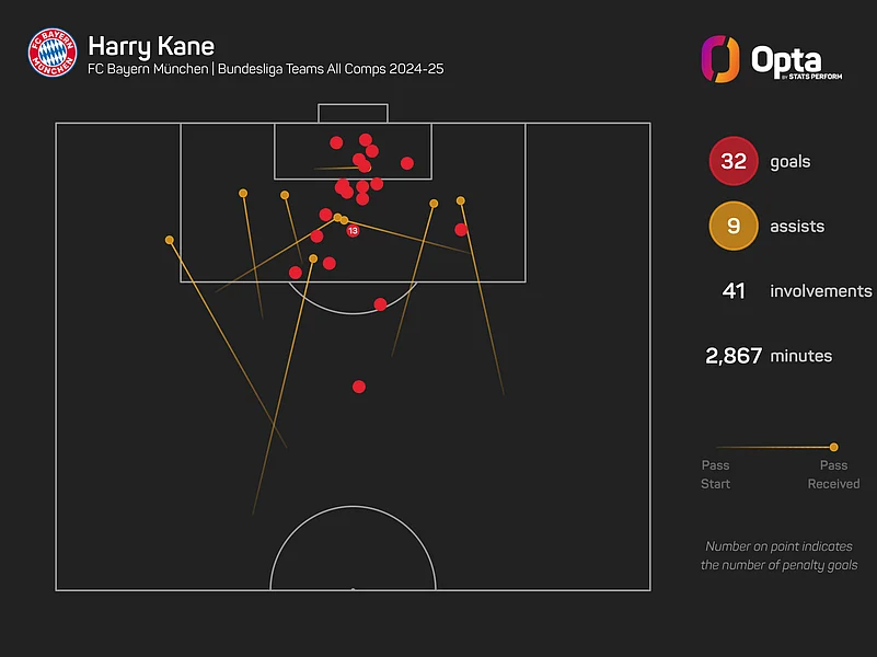Robert Lewandowski (35) is the only player in Europe's top five leagues to score more goals in all competitions than Kane (32) in 2024-25 and, while playing under Tuchel at Bayern, the England captain scored 44 goals.