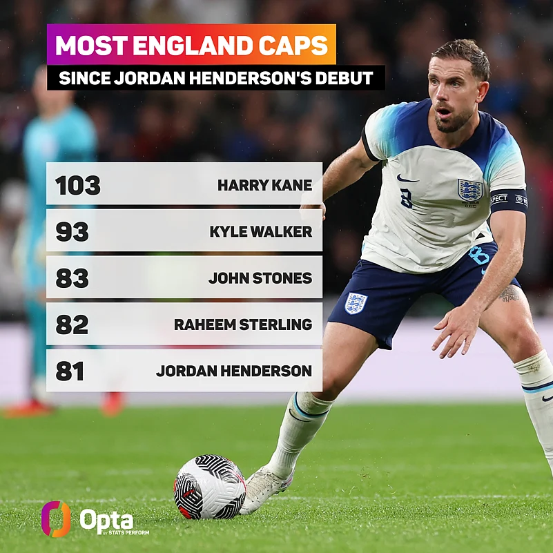 Henderson has 81 England caps. Since his international debut in November 2010, only Harry Kane (103), Kyle Walker (93), John Stones (83) and Raheem Sterling (82) have played more times for the Three Lions.