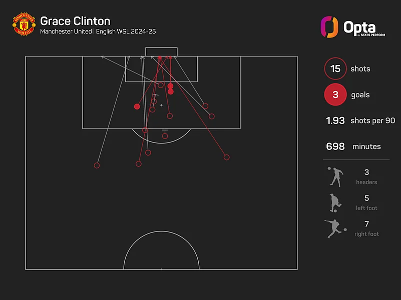 However, Man United's Grace Clinton is one of the possible players who may step up to the mark. She has scored in two of her four England appearances, including last time out against South Africa. Should she score in back-to-back outings, she would be the youngest to do so (21 years, 244 days) for the Lionesses since Jordan Nobbs in October 2013 (20y 327d).