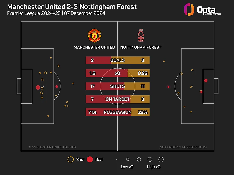 United finished with an expected goals against (xGA) of just 0.8, yet Forest scored three times. While that suggests the quality of finishing by Nuno Espirito Santo's team was high (indeed, their xG on target was 1.5), it also hints at a slice of misfortune for Amorim's men.