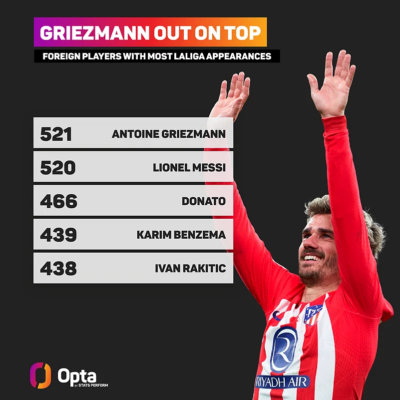 During Atletico Madrid's 1-1 draw against Espanyol, Griezmann made his 521st La Liga appearance, a new record among non-Spanish players.