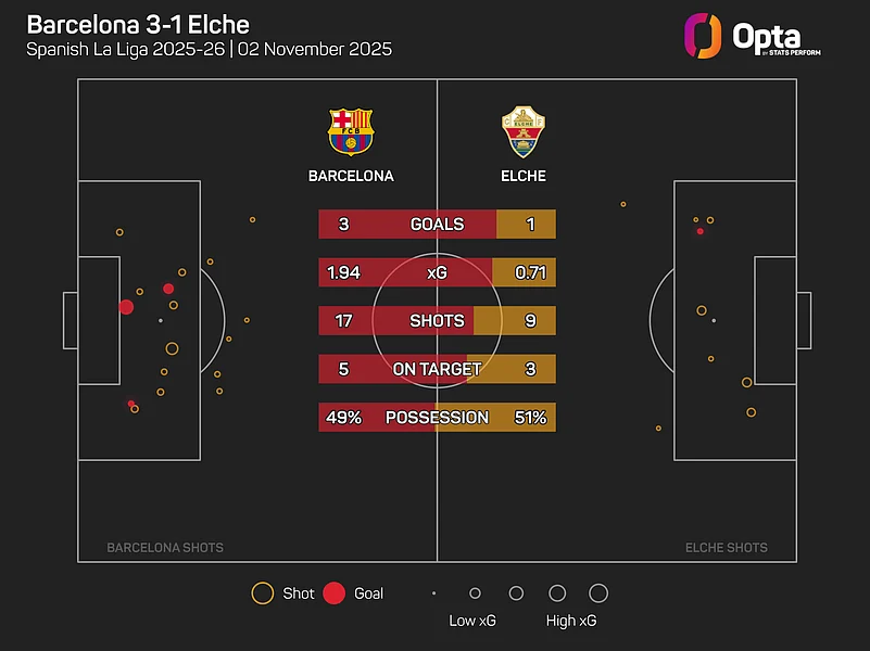 Barcelona were far from their very best here, despite registering an expected goals (xG) total of 1.94 from their 17 shots to Elche's 0.71 from nine attempts, but their individual quality in the final third once again proved to be the difference.