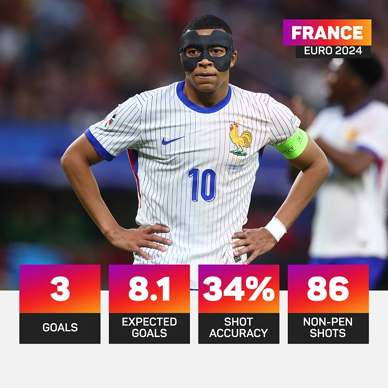 At Euro 2020 and Euro 2024 combined, he has scored just one goal from 34 attempts with a 3% conversion rate. At the 2018 and 2022 World Cups, he netted 12 times from 39 shots (31%).