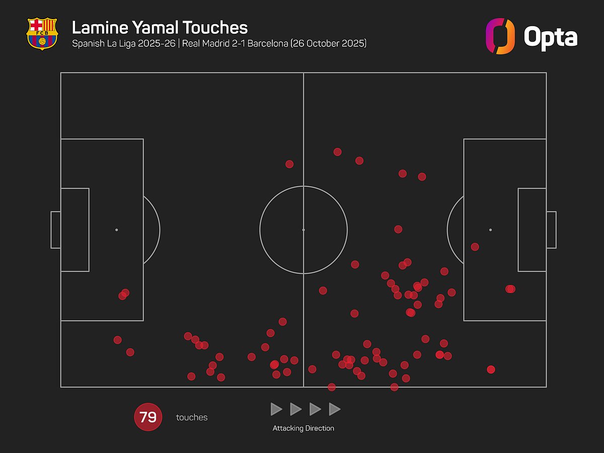 Yamal only had two shots totalling 0.03 expected goals (xG) at the Santiago Bernabeu, and though he created two chances for team-mates, he was limited to three touches in the Madrid area and lost possession 22 times – the most of any player on the pitch.