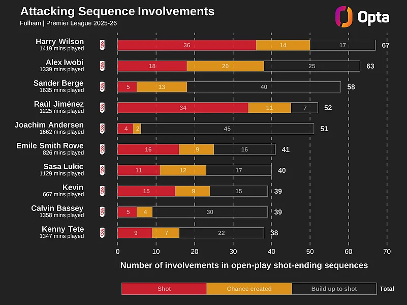 Fulham's last seven Premier League goals have been scored by six different players, with only Raul Jimenez netting twice in that span (also Wilson, Reed, Tom Cairney, Emile Smith Rowe and Calvin Bassey). If their charge up the table is to continue, that collective approach could be crucial.