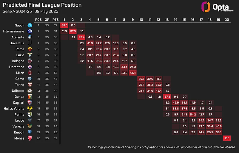 Inter are handed just an 11.8% chance of lifting the title to Napoli's 88.5%, though a win would put the pressure on Antonio Conte's side.