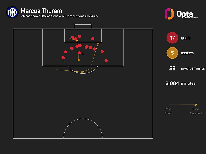 Across all competitions, Thuram has netted 17 goals from 12.96 expected goals (xG) and also provided five assists, the joint-second-most across the team (Nicolo Barella and Federico Dimarco top with eight).